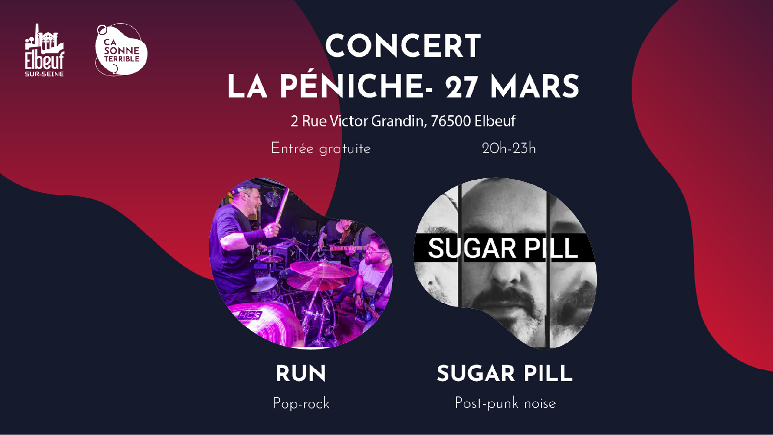 ✅ 2 groupes au programme : Run (Pop-Rock) et Sugar Pill (post-punk noise) !